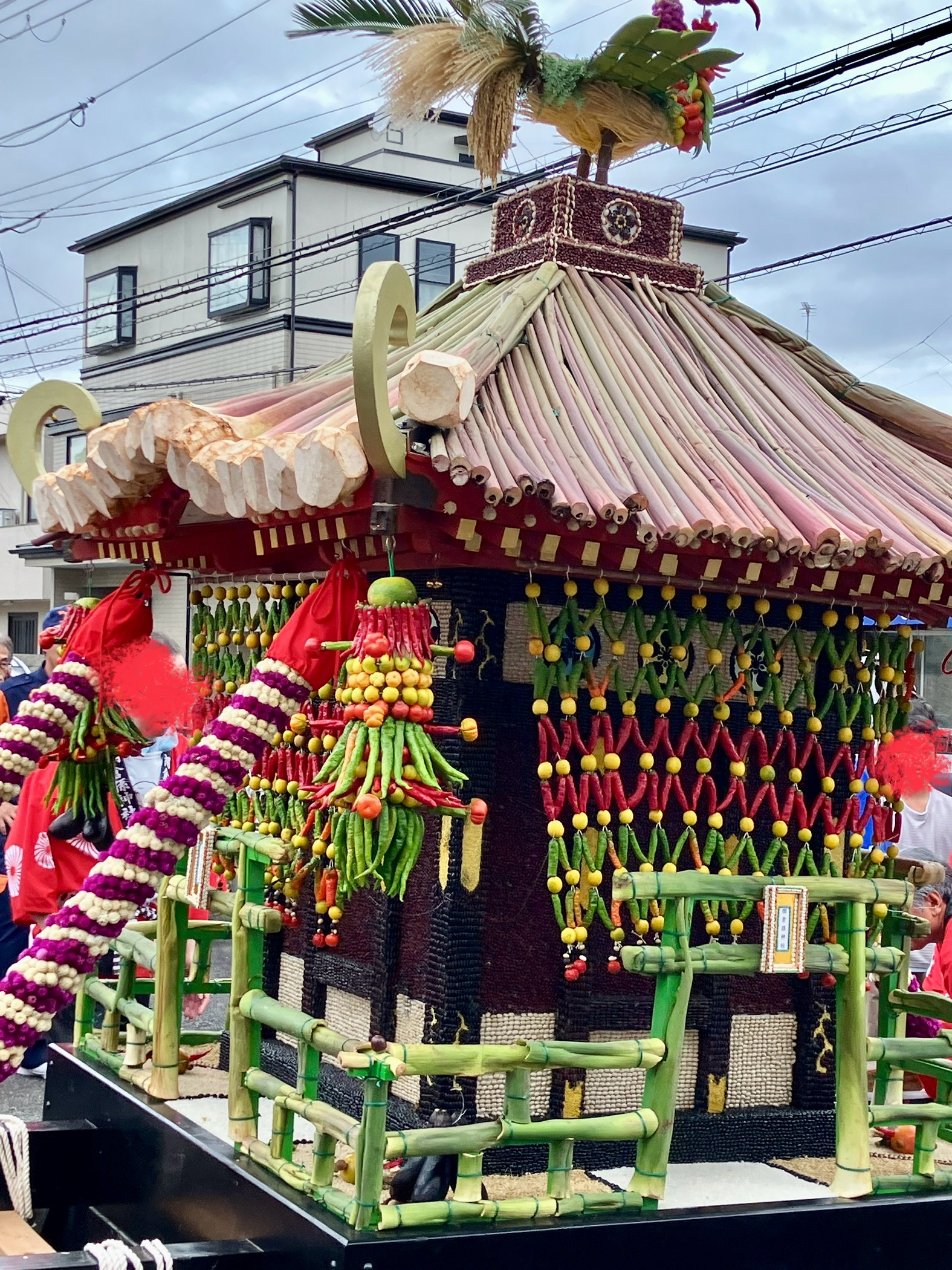 京田辺ルリエ近くで野菜・穀物で飾り付けられた神輿を発見! 調べによると京田辺市の無形民俗文化財第2号に指定されているとか。…